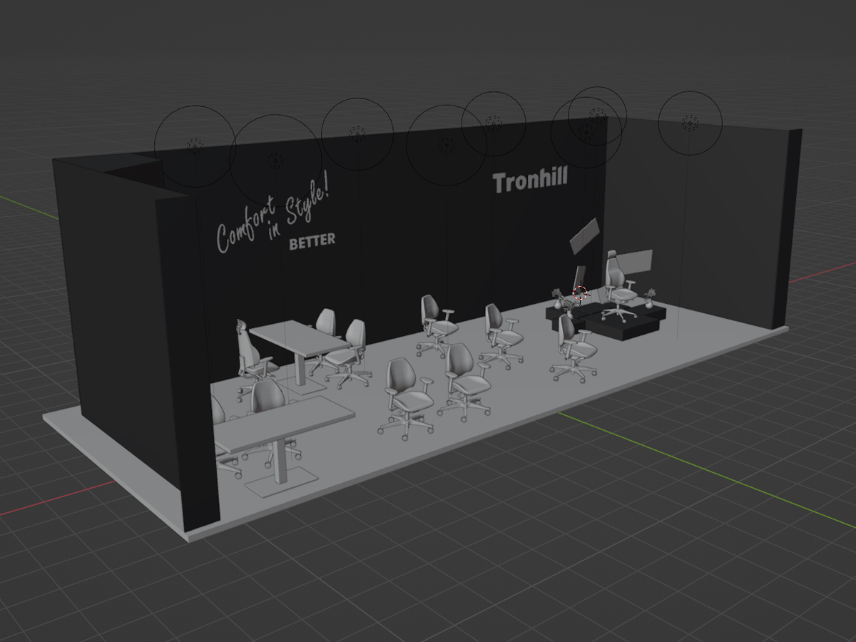 Įgyvendinta parodų erdvė pagal nustatytą biudžetą, pasitelkiant 3D modeliavimą „Blender“ programoje.